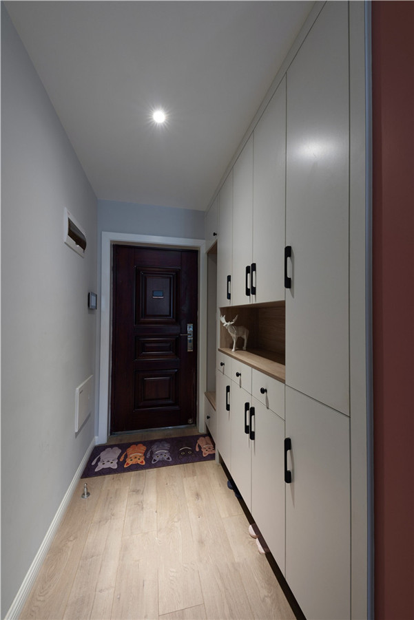 玄关鞋柜和换鞋凳一体,方便坐下来换鞋。中间台面用来放钥匙、拆快递的小刀、包包等出门要带的小物。