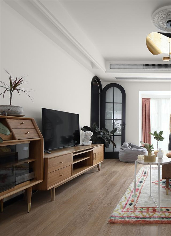 玄关选择地砖,带有彩色水磨花样质感,与客厅地板相联接,能让入户区的配色变得轻松愉悦,很有小心机的清新文艺色调设计。