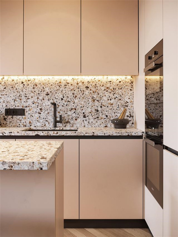 厨柜设计,将台面与墙面选择水磨质感墙砖,厨房瞬间就暴露了女性的少女心,厨房生活满怀浪漫,搭配哑黑的水槽、龙头、甚至插座,都非常有质感。