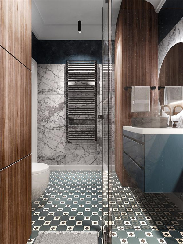 当然卫生间肯定也逃不掉美美地又文艺气息的地砖,这种蓝白相间的拼花地砖,运用在浴室空间,显得非常文艺小清新,即便搭配黑胡桃色,也一样很小资。