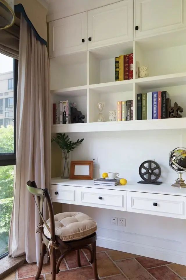 对于空间面积有限的户型来说,利用阳台打造一个小书房也是很不错的,在这看看书、办办公、玩玩游戏,都是很不错的选择,很是安静!