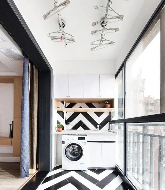 阳台上最常见的就是各类保洁用品了,比如拖把、水桶、洗衣机、清洁剂、晾衣杆和衣架等等,所以必须规划出一个合理的阳台家务区。