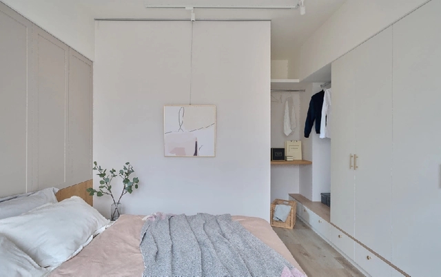 厨房一改以往幽暗的环境,白色使厨房干净明亮了很多。U型的橱柜增加了储物空间,很适合小户型,在灶台旁的窗起到了一定的照明作用和通风作用。另一侧的墙面上设计了挂勾,充分利用墙面进行收纳。台面的颜色和地面的原木色瓷砖让厨房避免了单一白色的单调,也提升了厨房的颜值。
