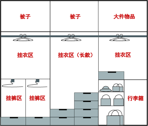 顶部区域:拿取不方便,建议放比较轻的换季衣服和被子,高度设计在30-40cm的宽度,预留空间放装了棉被的压缩包和收纳盒。