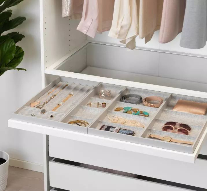 做一个高度 6cm~12cm的格子抽非常实用,用它来放皮带、领带、丝巾、袜子、饰品等,内部进行分格,非常好用,东西不会全部堆在一起。