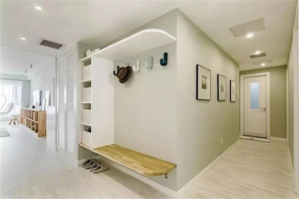 入户空间小,可以沿着墙面做一排鞋柜,将入户门内开改外开,这样更能节省室内空间。如果入户门位置到了墙角,厚度不够做鞋柜,还可以把墙面敲掉,做嵌入式鞋柜。