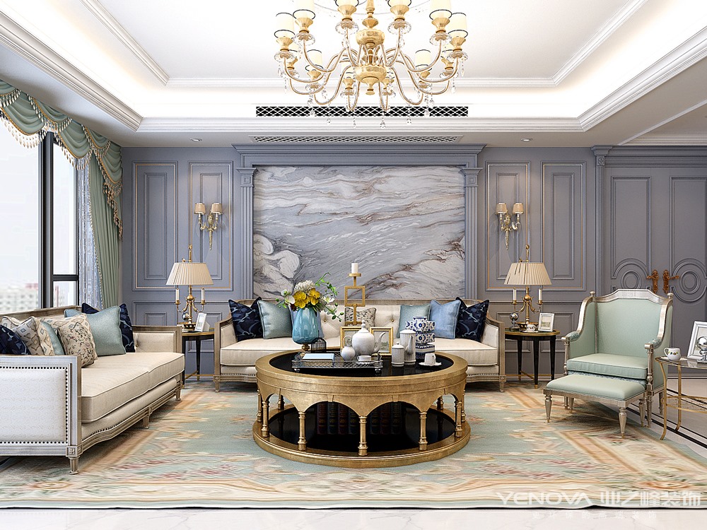 设计说明:一抹和柔轻缓的浅灰蓝,大面积清新的白,牵引出法式古典的浪漫情韵,奠定本套案例优雅温馨的基调。以浅色为主色调,用少许亮色进行点缀。在视觉感知上,浅色与深色相比,是令人觉得较为柔和、舒适的色调,而少许亮色的点缀,使空间在和谐统一的基础上更具视觉层次感,为空间平添几许温度与生气。