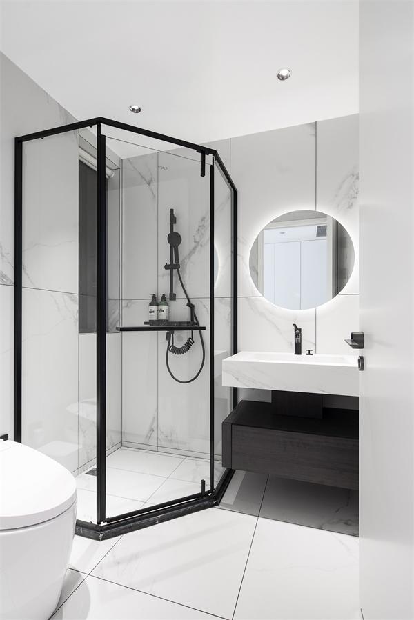 白色使用在浴室中特别有效。由于浴室中浴缸,马桶和水槽基本都是白色,其他白色的使用就可以让空间形成无缝对接,使空间通透而产生扩张感。