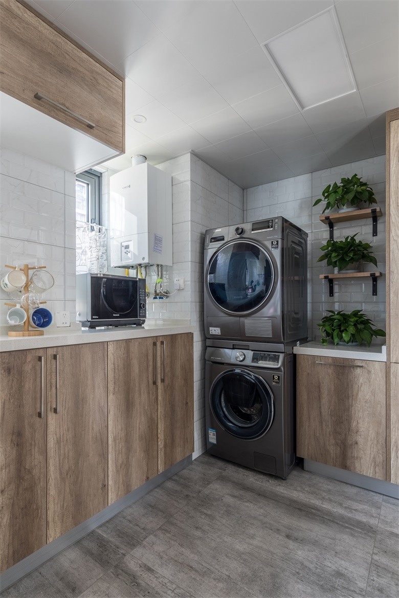 厨房拥有良好的上下水系统,若没有其他空间摆放,洗衣机烘干机也可以放在这里。注:根据使用者身高确定洗衣机柜台面与整体橱柜同一高度还是做错层。