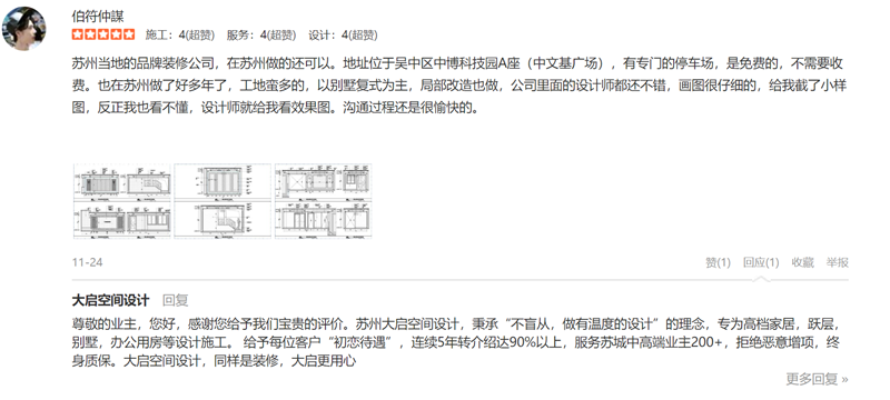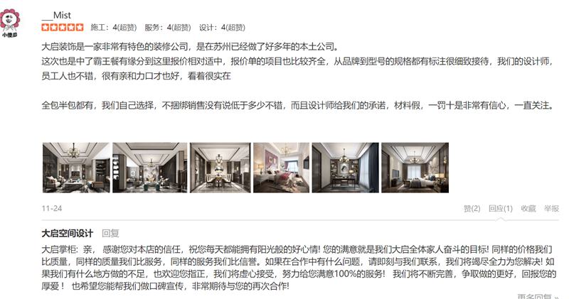 在此,也感谢大家给予我们宝贵的评价,是鼓励,也是鞭策。苏州大启装饰,秉承“不盲从,做有温度的设计”的理念,专为高档家居,跃层,别墅,办公用房等设计施工。 给予每位客户“初恋待遇”,连续5年转介绍达90%以上,服务苏城中高端业主200+,拒绝恶意增项,终身质保。大启空间设计,同样是装修,大启更用心!
