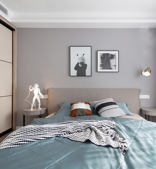 在床头的墙面刷上一些淡雅的乳胶漆,然后再搭配上一些艺术画。简简单单就能把卧室打造的很温馨。尤其是运用一些高级灰的色调,不仅迎合时下流行的北欧风,而且文艺感十足。