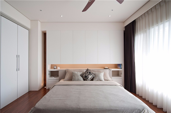 卧室门扇所采用的材料应尽量厚点,不宜直接使用3厘或5厘的板材封闭,如果用5厘板的,宣在板上再贴一层3层面板。门扇的下部离地保持在0.3-0.5cm左右。窗帘应采用厚质和布料,如果是薄质的窗帘也应一层纱窗层。这对减少睡眠时光线的干涉也是有利的。另外卧室还需具有一定的隔音能力。