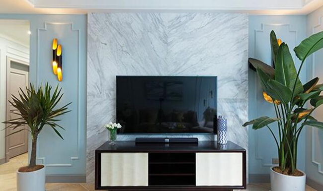 选用大理石做背景墙环保耐用,但由于使用特殊粘胶铺贴固定,拆卸十分麻烦。因此在装修规划时,需要根据摆放的家电器尽可能明确的规划好电路布局,以免入住后才发现电线仍然外露的尴尬。