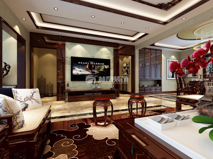 1. 客厅说明:客厅顶棚采用了回形吊顶设计,体现了中式中国结的元素,吊顶里面收了木线体现了中式原木的质感,沙发才用的是实木雕刻沙发体现了中式手工雕刻的工匠特色,地毯的纹理是祥云图案也是中式文化的体现