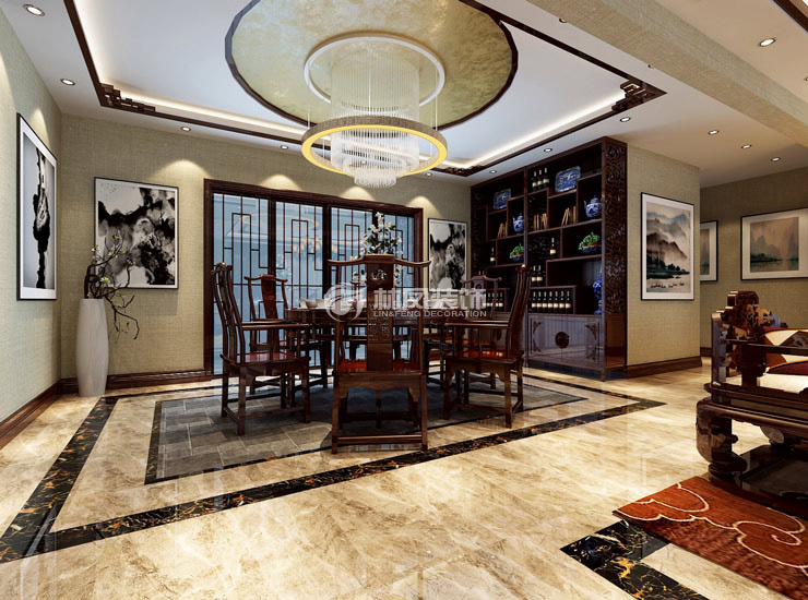 2. 餐厅说明:餐桌采用的圆形餐桌体现了中式的天圆地方寓意,地面进行了收边线铺设体现了区域划分,餐厅背景是博古架体现了主人的收藏文化,也展示了主人的内涵及品位。米色的壁纸搭配黑白的水墨画很有中式文化的韵味