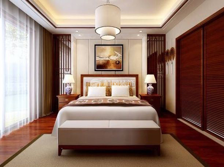 3. 主卧室说明:主卧室才用的是红木地板非常有品位,床头背景做的是米色软包墙面,体现了中式的刚柔融合,吊顶采用了回形吊顶体现了中式的对称法则。