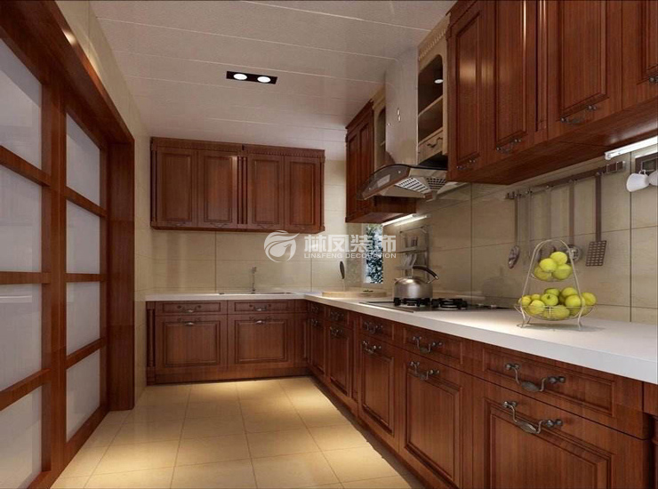 4. 厨房说明:厨房采用的是米色的墙砖很温馨,橡木色的实木橱柜很有档次柜门上的回形图案也体现了中式特色。白色的吊顶非常的干净亮丽