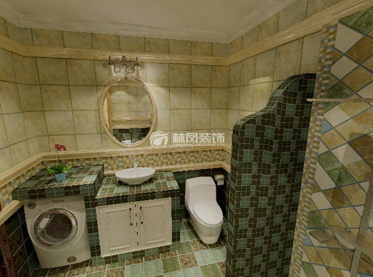 5.卫生间说明:卫生间采用的是文化砖,绿色的小格子砖体现了中式的春意盎然,砌筑的洗手台很有特色,绿色的墙砖搭配米色的墙砖在颜色上也是互补。