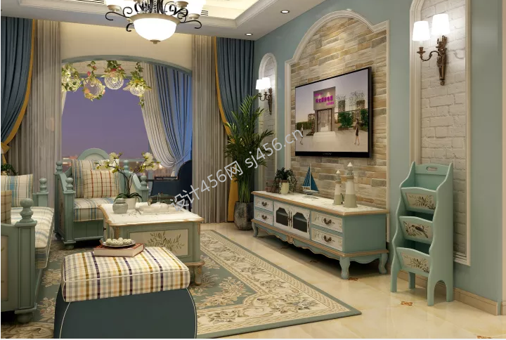 97㎡地中海风两室两厅客厅电视墙装修效果图