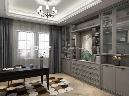 第二款时尚轻奢风格装修效果图的设计中,我们看到这是一个书房的设计。书桌非常的简单,就是一个黑色的实木材料的桌子。然后放了一盆花作为装饰,有一个小窗户用来采光。落地的大窗帘是深灰色的材料,看起来非常的时尚。地面选用的是原木色的瓷砖还铺有一块造型的圆形地毯。书柜是整面墙的设计,用许多的架子做了风格看起来就非常的时尚。吊顶处是一个二级吊顶,中间的一款吊灯显出轻奢的品味。