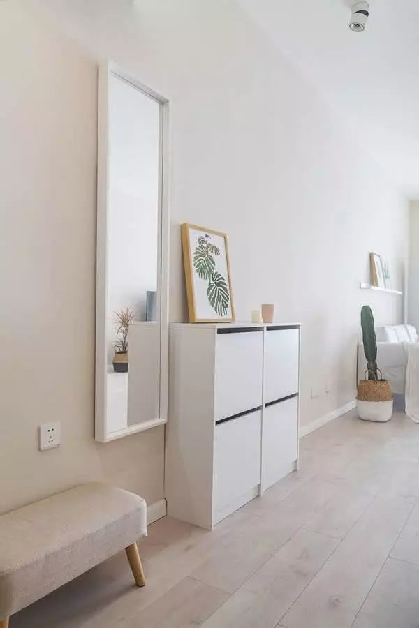 简单而又舒适的一张换鞋凳、一面白色的时尚全身镜、一个白色成品鞋柜、一幅简单的装饰画便勾勒出一个美丽之家的前沿~