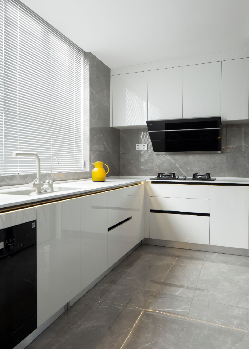 将灰色调与金属完美吻合,灰色系列选用暖灰;整体空间在留灰和白的基础上采用同色调的灰色石材,钛金加以点缀,既保证了符合