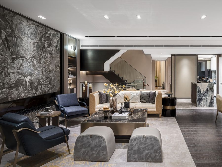 3、别墅的客厅比较大,是一个非常重要的地方,因此,在设计中,要注意整体和局部控制的空间。在别墅的高层建筑处理中,有必要添加辅助照明、墙面装饰、围栏形式,以丰富别墅的空间感。