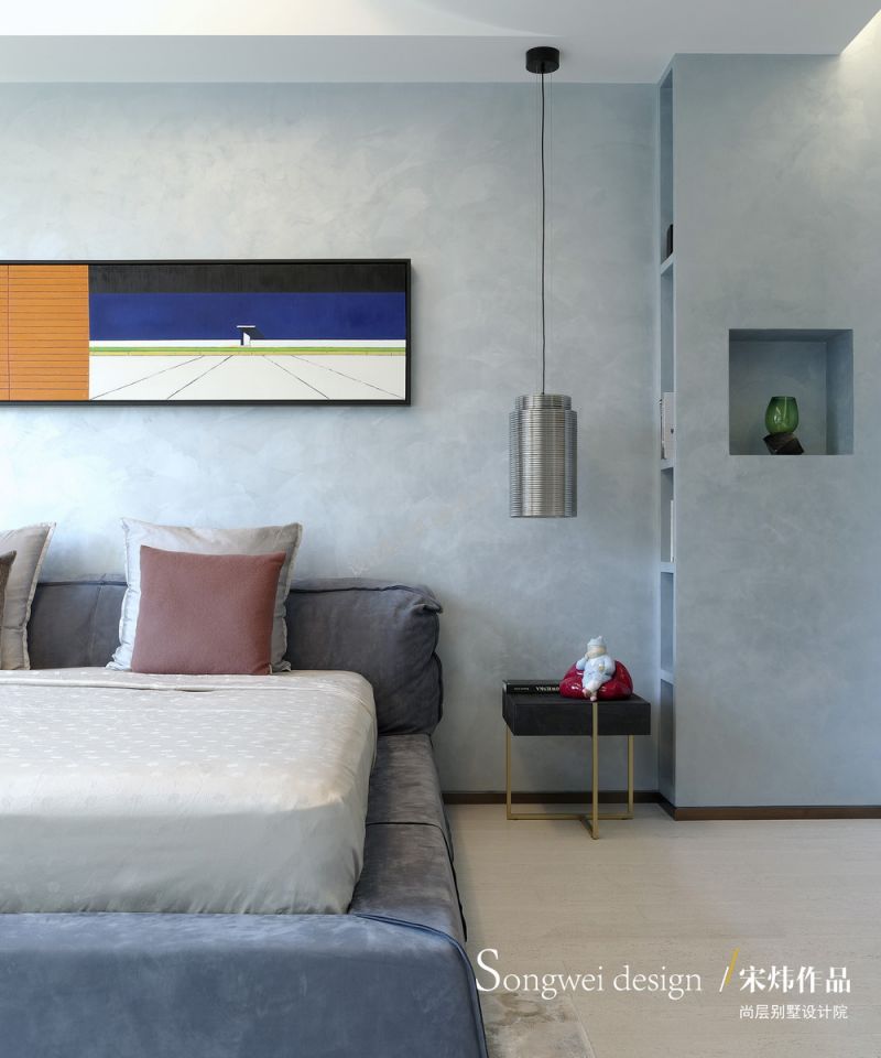 设计理念: 阿吕:“我从小就喜欢摩托车,后来专长是修摩托车,我的同学都离开了老家,去了城市,但我没走,在我们那里,我开了一家摩托车的铺子。”江河:“是因为留恋吗?”阿吕:“不,因为城里禁摩。” ——韩寒 从这一秒钟开始,几声沉闷的嘶鸣后,是一阵阵着实而浑厚的狂吠声,猛然抬头,早已双目紧盯,直逼而来,心头骤紧,这是……什么? 开门望去,远处是一个对业主来说有特殊意义的雕塑——业主说:“事业很忙,但不想因此而忽略了家人。”所以在和设计师一起挑选时,选择了这款寓意为“平衡”的小天使,希望可以时时提醒自己,要平衡好家庭和事业。右前方的群青色块儿随即进入眼帘,再往里,便是与那狂吠的大魔王一起驰骋的骑服和头盔,他们暴躁的矗立着,期待着下一次的征程…… 阿吕:“我从小就喜欢摩托车,后来专长是修摩托车,我的同学都离开了老家,去了城市,但我没走,在我们那里,我开了一家摩托车的铺子。”江河:“是因为留恋吗?”阿吕:“不,因为城里禁摩。” ——韩寒 从这一秒钟开始,几声沉闷的嘶鸣后,是一阵阵着实而浑厚的狂吠声,猛然抬头,早已双目紧盯,直逼而来,心头骤紧,这是……什么? 开门望去,远处是一个对业主来说有特殊意义的雕塑——业主说:“事业很忙,但不想因此而忽略了家人。”所以在和设计师一起挑选时,选择了这款寓意为“平衡”的小天使,希望可以时时提醒自己,要平衡好家庭和事业。右前方的群青色块儿随即进入眼帘,再往里,便是与那狂吠的大魔王一起驰骋的骑服和头盔,他们暴躁的矗立着,期待着下一次的征程……