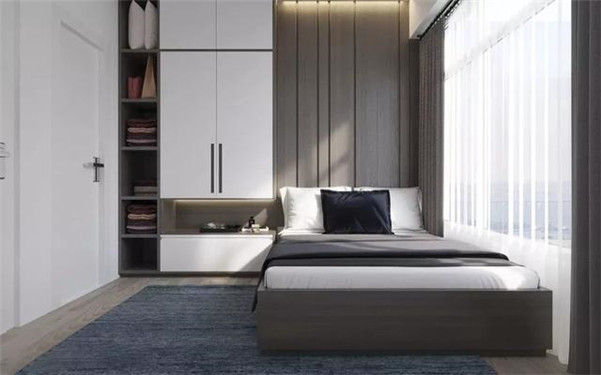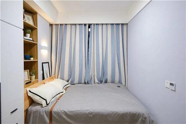 小户型卧室也有许多屋主会把床放在其中一侧,那么另一侧就可以选择做上到顶的柜子,给柜子搭配一些开放式的格子,避免太过压抑。
