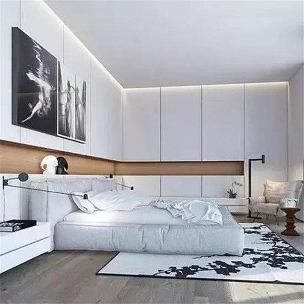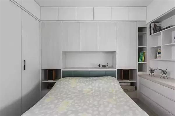 把卧室的床给做成嵌入式的,四周都环绕着柜子,中间留空的区域作为背景墙,刷上自己喜欢的墙漆或者铺贴壁纸,好看又实用。