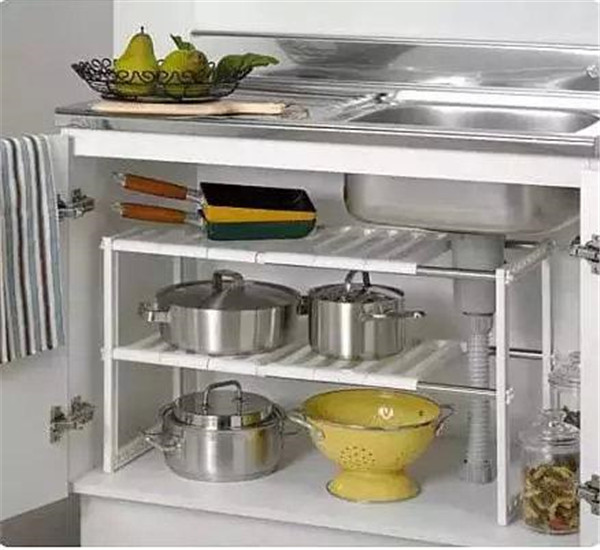水槽下的橱柜,常常因为有管道收纳有限而被嫌弃,这里我们要借助收纳工具来帮忙。