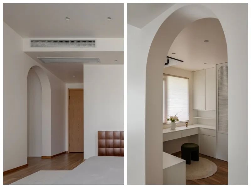 在两个功能区之间用拱门来做过渡,既能做美化,又有穿越场景的感受,还不会占用地面空间,可谓是一举多得。例如在玄关、衣帽间的门洞做上圆拱门,迈过它仿佛就踏进了时尚的国度。