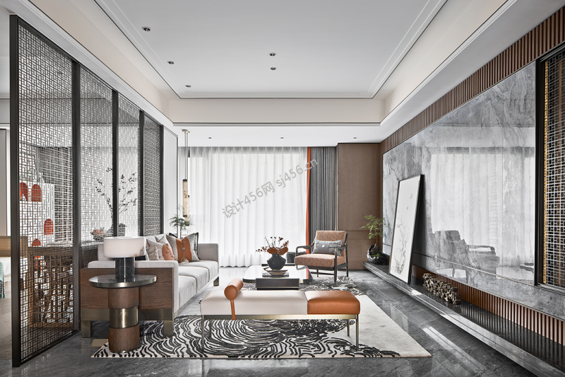 115㎡三居室新中式风格客厅吊顶装修效果图