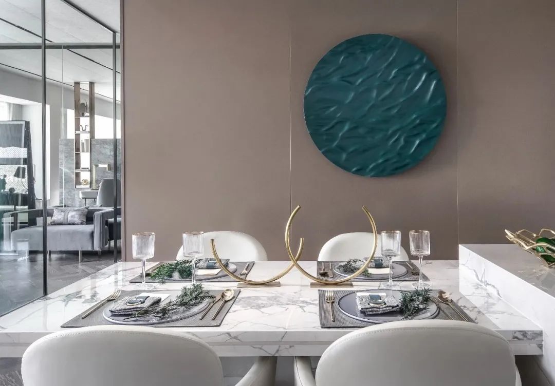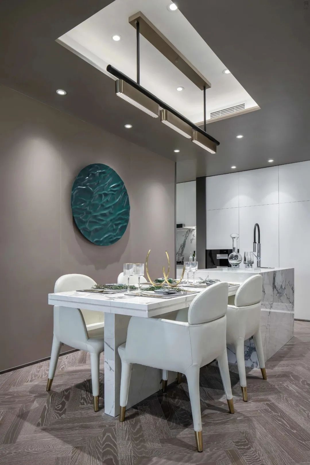 ▲餐厅的咖灰色墙面延伸到天花,天花四周吊平+中间留空,四周的筒灯+中间的金属轻奢吊灯,也让空间显得更加高级有层次感。白色大理石的餐桌,还有皮艺的白色金属架餐椅,布置在空间里,也透露出一种高级优雅的现代感。