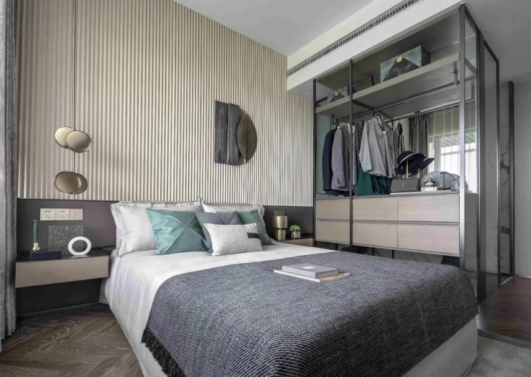 ▲卧室在长城板的床头墙基础,侧边的衣柜是开放式+抽屉的设计,布置上简约舒适的床铺,带来了一个安静优雅而实用的卧室空间。