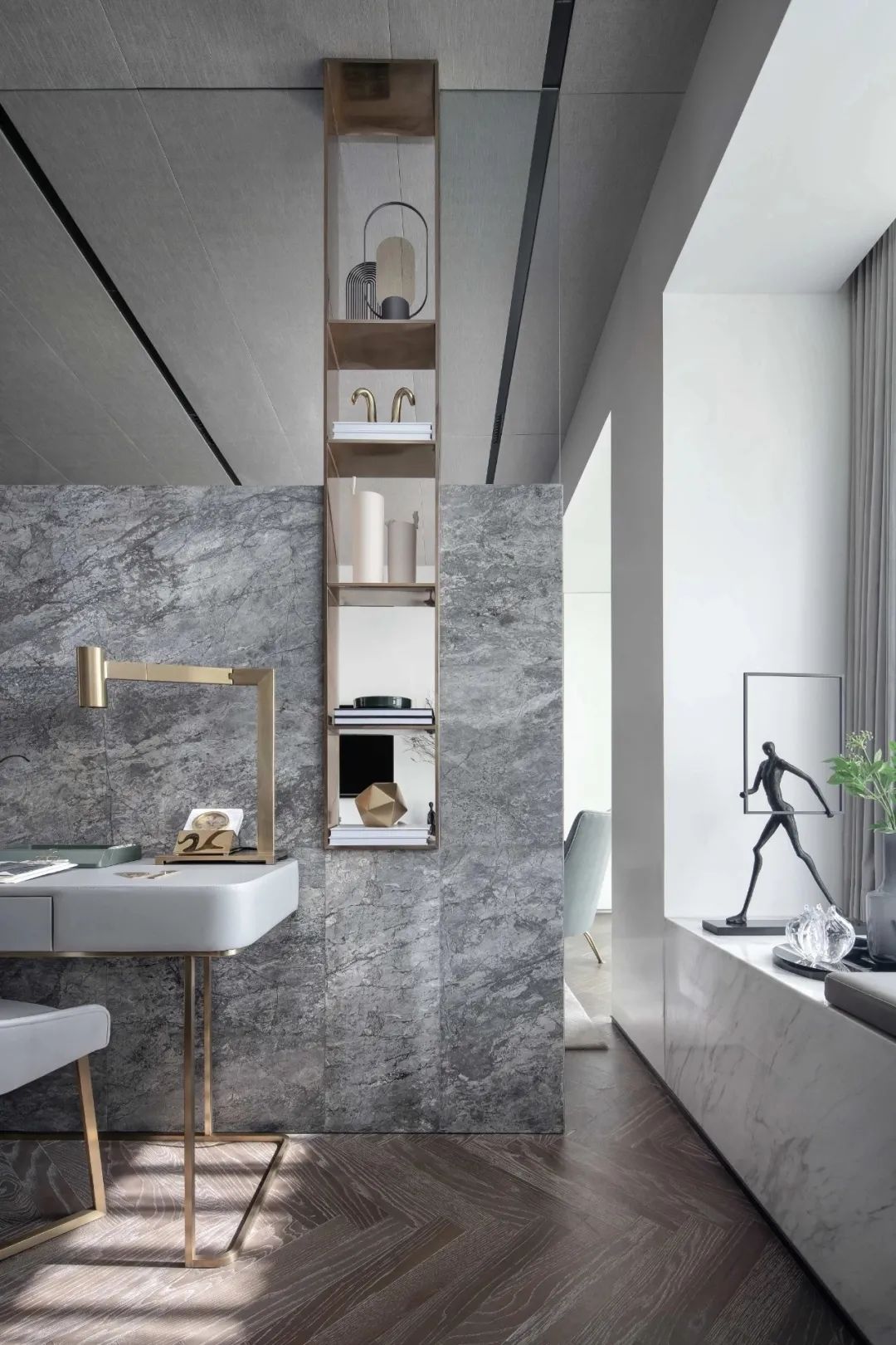 ▲沙发墙里的加入大理石与玻璃质感的设计,显得时尚而高级。结合大理石金属质感的茶几,现代优雅的软装沙发与沙发椅布置,也显得更加舒适闲适。