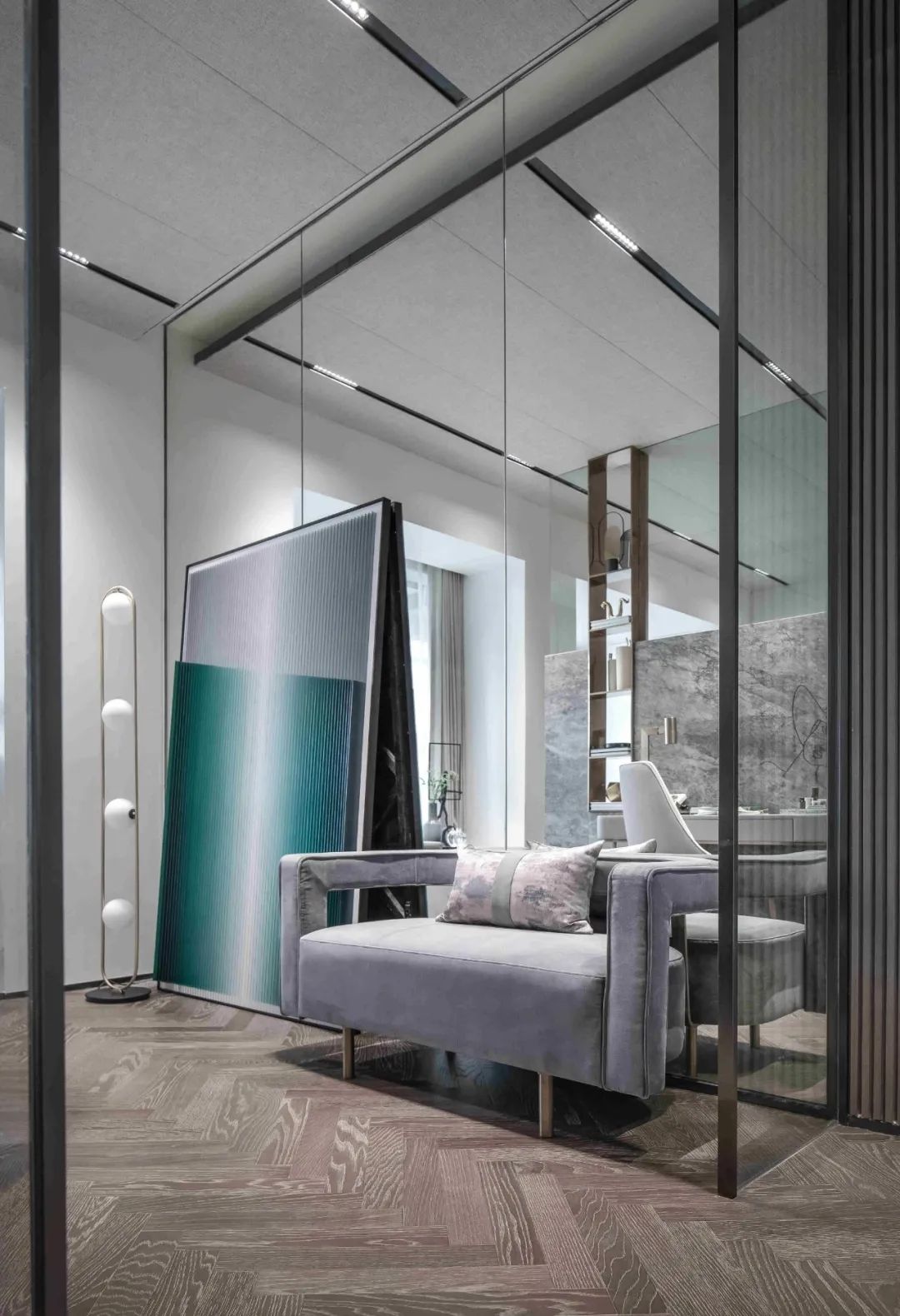 ▲书房的书桌后的墙面,一整面墙都加入了玻璃镜面的材质,布置休闲沙发与一幅现代感强烈的装饰画,也让空间显得更加高级明亮而优雅。