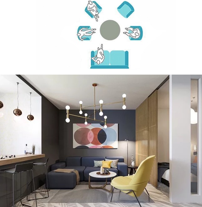 4、这种客厅的布局是比较适合聚会和聊天的家庭,可以把双人或者三人沙发或者其他,围绕茶几组成一个圈,有点像餐厅的那种感觉。这样的布局会让聊天聚会都很温馨,聊天的时候即便是坐的位置在不同的方向,但也不需要转过头就能看到对方的脸。