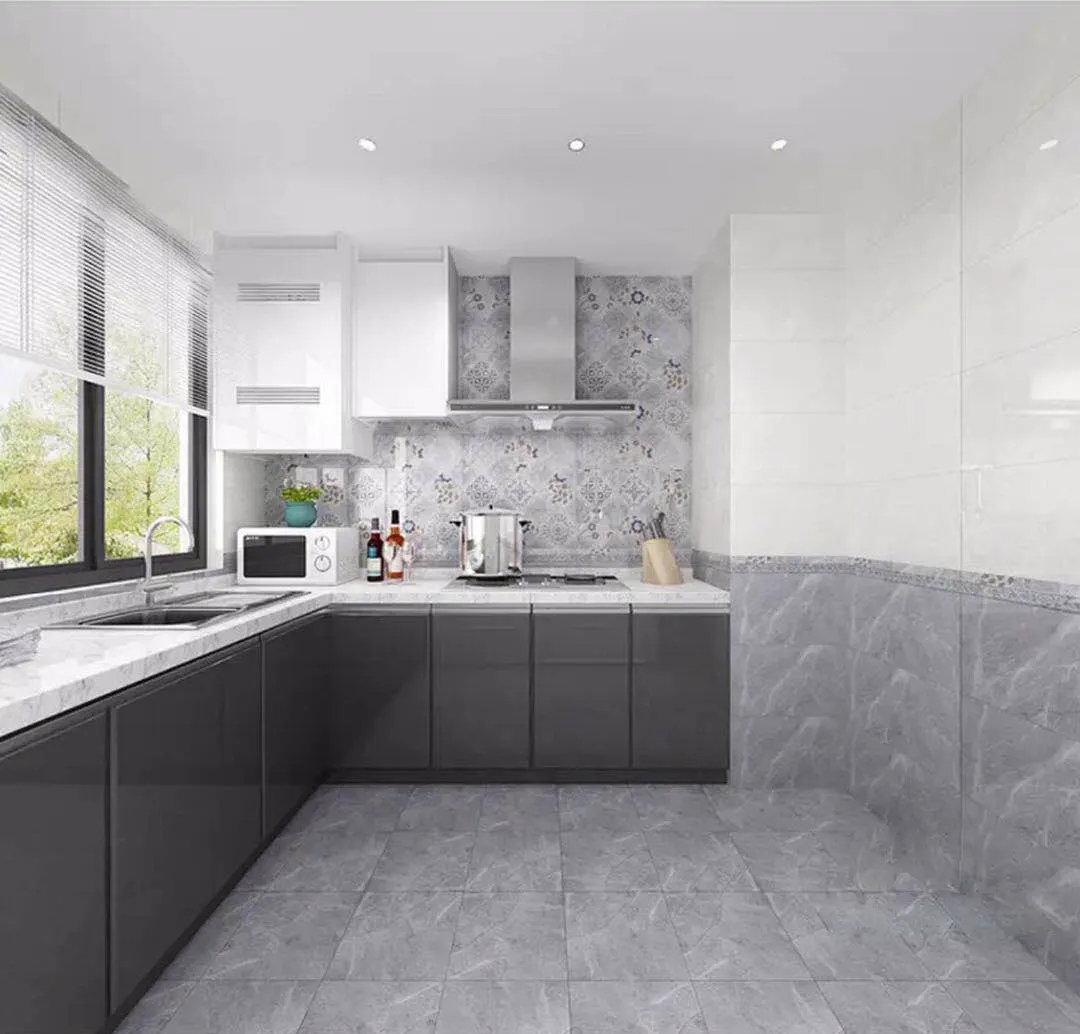 厨房空间相对比较容易潮湿,因此对防滑会有一定的要求,另外灰色也是一种比较百搭的颜色,因此防滑而又简约的灰色哑光砖,就成为了多数厨房装修的首要选择方案了。