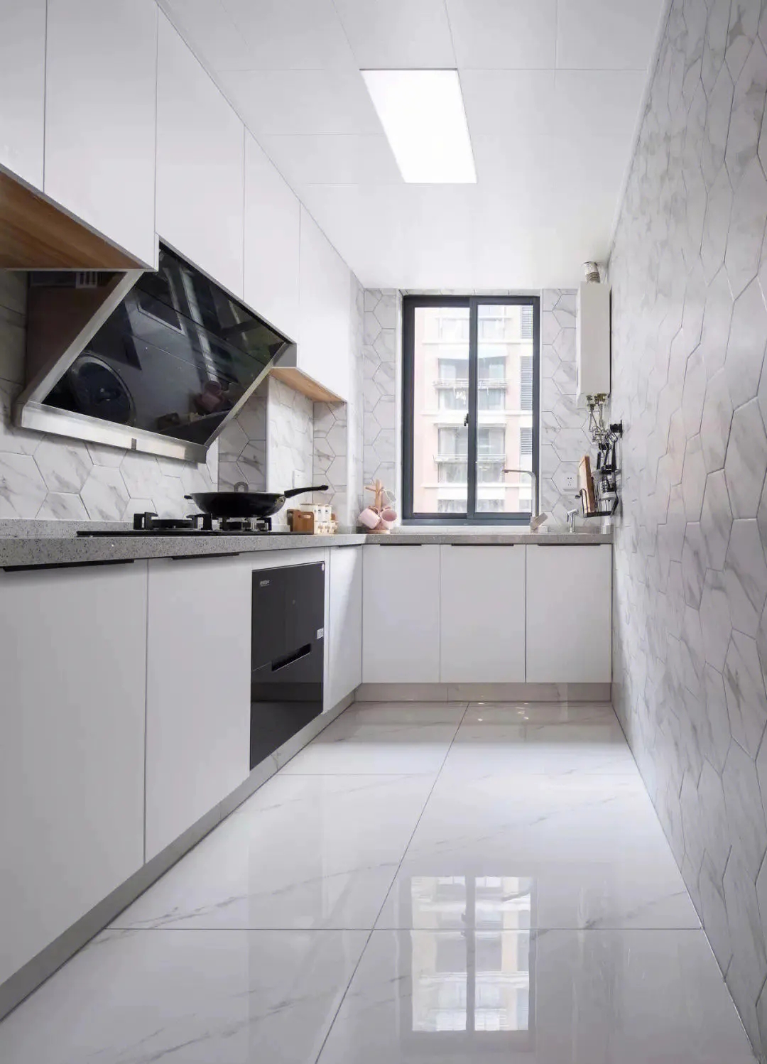 相比灰色的冷淡,雅白的这样干净优雅的地砖,用在厨房的墙面,再搭配上白色的墙面砖,整个空间会显得更加明亮干净大方。