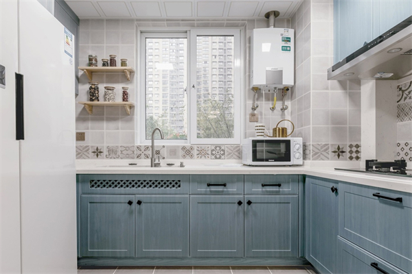 3、清澈浪漫的蓝色:蓝色到处都是那么可爱,总是给人一种清晰而浪漫的感觉。总是很容易让人联想到天空和海洋,让人思考,营造出一种平静祥和的氛围,在更多的空间中使用,会给人一种自然的感觉。蓝色自然会放松人们的神经,工作繁忙的人不妨考虑选择它,让您在厨房享受轻松的时光,优雅的氛围让您心情愉快。