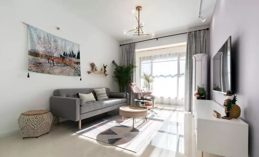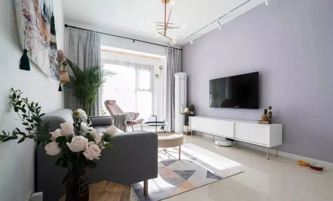客厅的电视背景墙是刷成了了浅灰色,电视背景墙上也不做任何装饰,客厅的顶部也没做吊顶,这样的设计让人感觉非常简洁大方。