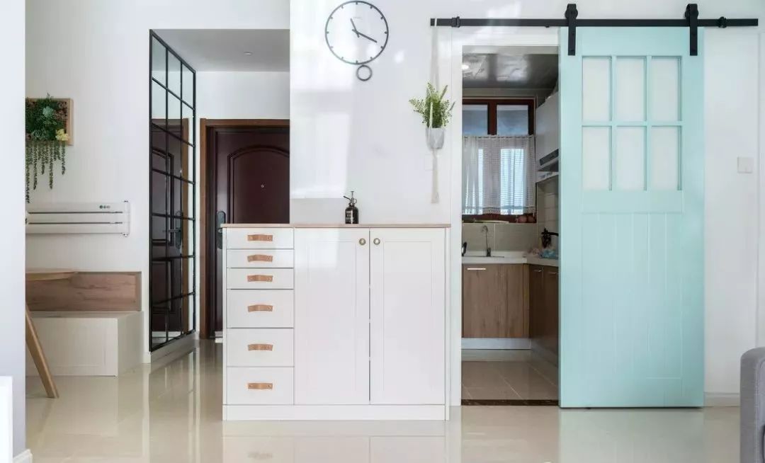厨房位于客厅的一侧,用一个青色的谷仓门作为隔断,厨房内部L形的橱柜满足收纳和使用需求,木色和米色的结合让人感觉很温馨。