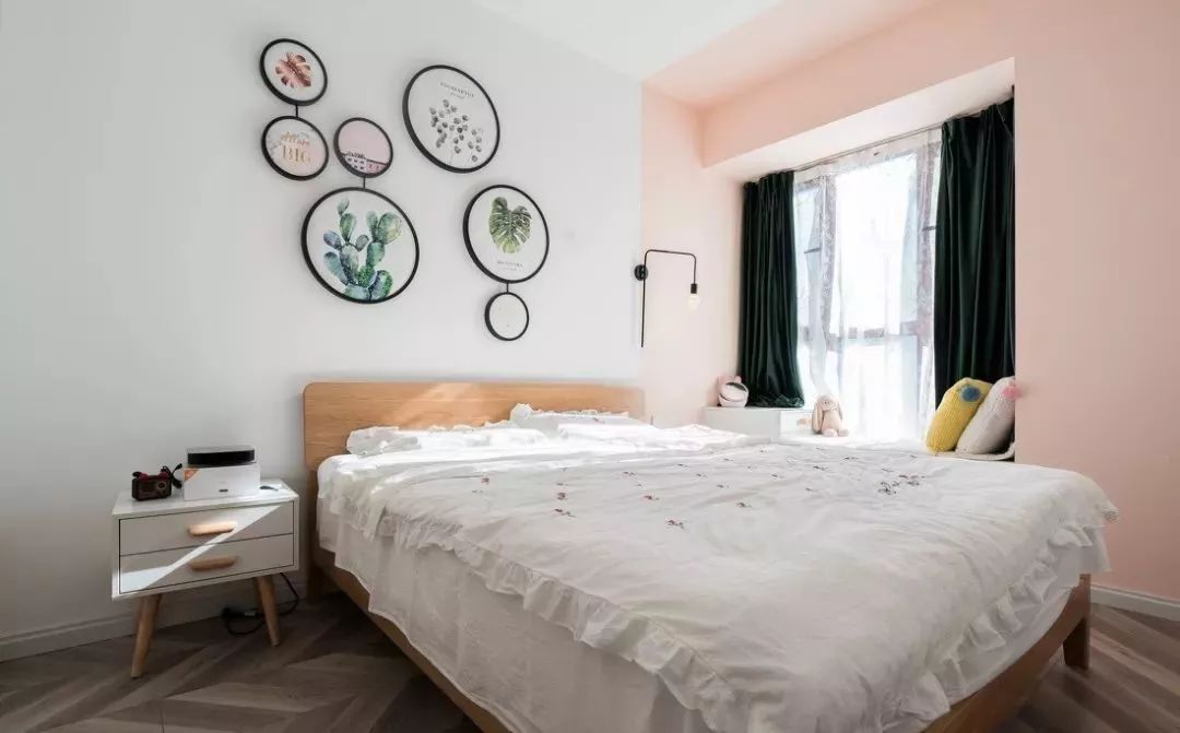 主卧室的床头背景墙上点缀着几个圆形的装饰,飘窗处的墙面选择了刷成淡粉色,地面的木地板做了人字拼,整个空间简洁而又清新。