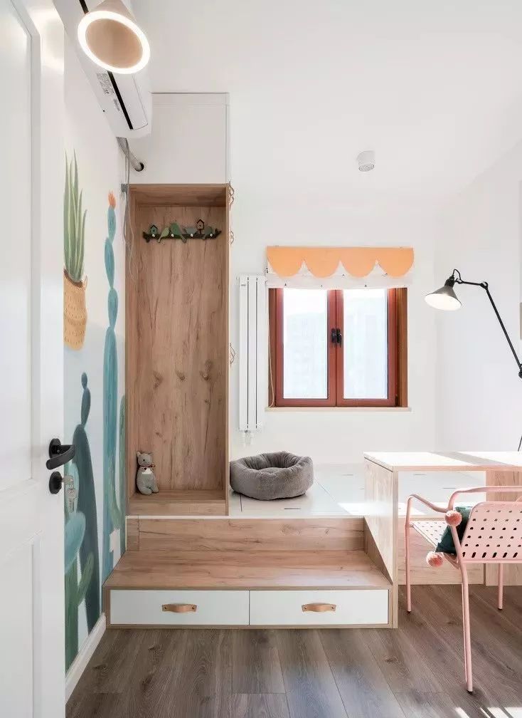 儿童房的墙面是做了绿植墙绘的设计,利用靠窗的位置来做个榻榻米地台床,书桌和衣柜都和床连接起来,让储物空间变的更为充足。