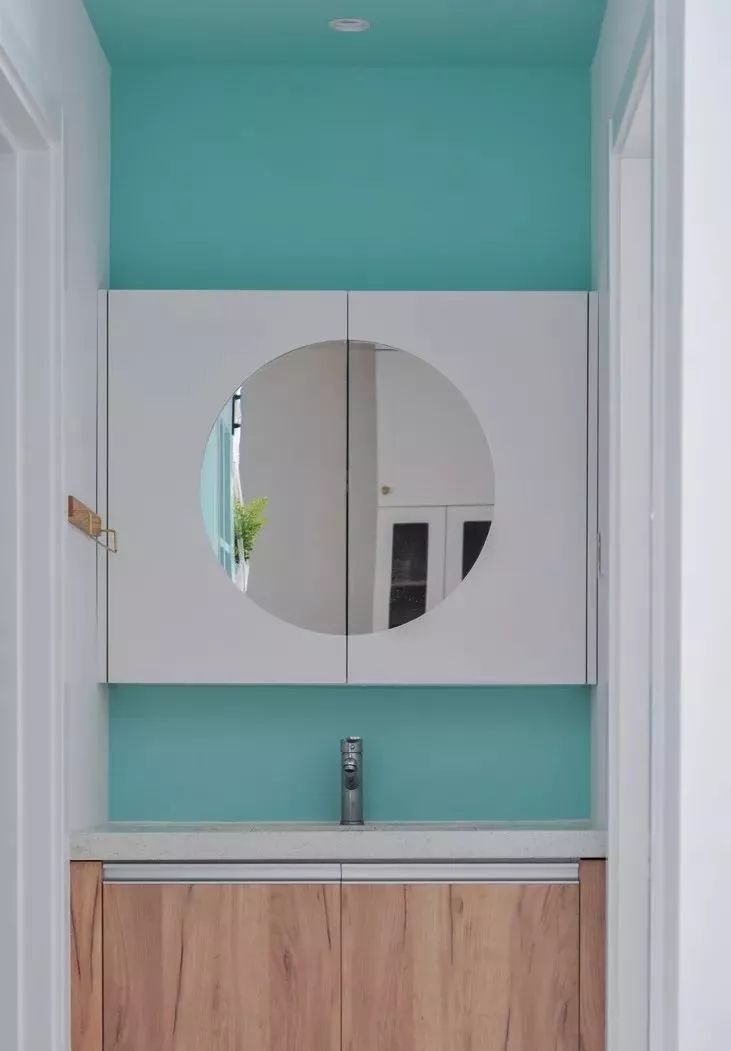 卫生间的洗手台被放在了卧室和卫生间之间的凹槽处,浴室柜结合镜柜的设计,满足洗手台的收纳需求,青色的背景墙给这个小空间增添了自然感。