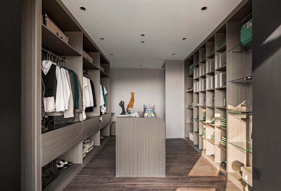3、如果是小户型在空间,不能满足的情况下,建议可以把衣帽间设计为平铺型,也就大家称作的“一字型”。一字型的衣帽间可以作为在主卧和主卫之间的隔断,虽然面积比较窄,但实际的使用功能还很强大。不仅是美观,而且也非常能利用到空间。是小户型也能享受到衣帽间的体验。