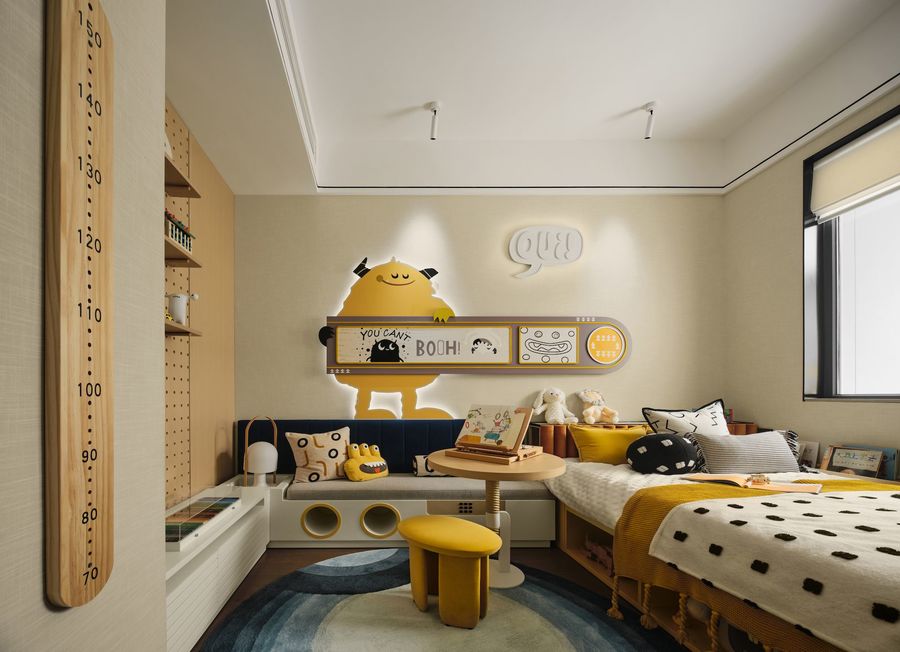 在装修儿童房时,可根据孩子的喜好来装饰。我们都知道,孩子最善于乱涂乱画了,这时可以在儿童房内选一面墙作为孩子的涂鸦墙,让孩子自己动手来彩绘。如果是女孩房的话,建议在室内摆上一些可爱的玩偶。如果是男孩房,可以在室内放上有趣的卡车玩具。