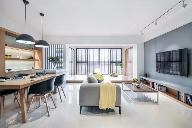 客厅与餐厅以开放的格局,电视墙以淡蓝色的硬包,并在下方电视柜装成收纳书架,整体现代自然而又舒适大方;天花上装上一组白 轨射灯,为空间的光影增添了几分温馨的效果;