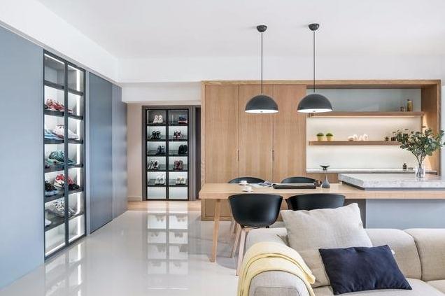 因为鞋子较多,走廊上以玻璃推门装了2个入墙的大鞋柜,方便主人平时出门找鞋;